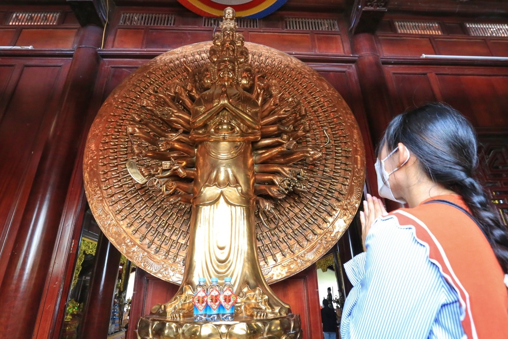 Năm 2017, chùa Pháp Vân được tiếp nhận thêm kỷ lục Việt Nam mới "Tôn tượng Bồ Tát Quan Thế Âm nghìn tay nghìn mắt (ở thế đứng) bằng đồng cao nhất Việt Nam". Ảnh: NHẬT THỊNH.