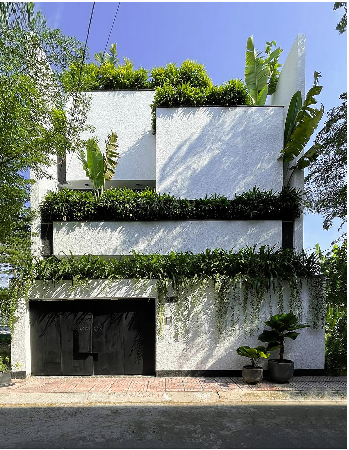 Ngay từ mặt tiền, On On House gây ấn tượng bởi những mảng cây xanh mướt đan xen với phần tường đặc.