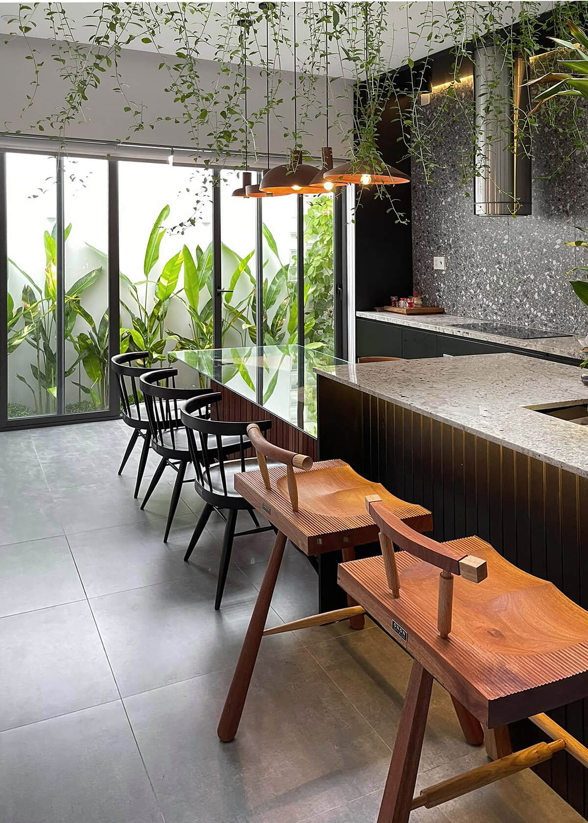 Hệ cửa kính lớn được sử dụng ngăn khu vực bếp và khu vườn nhỏ sau nhà nhằm mở rộng góc nhìn, khai thác tối đa ánh sáng và gió.