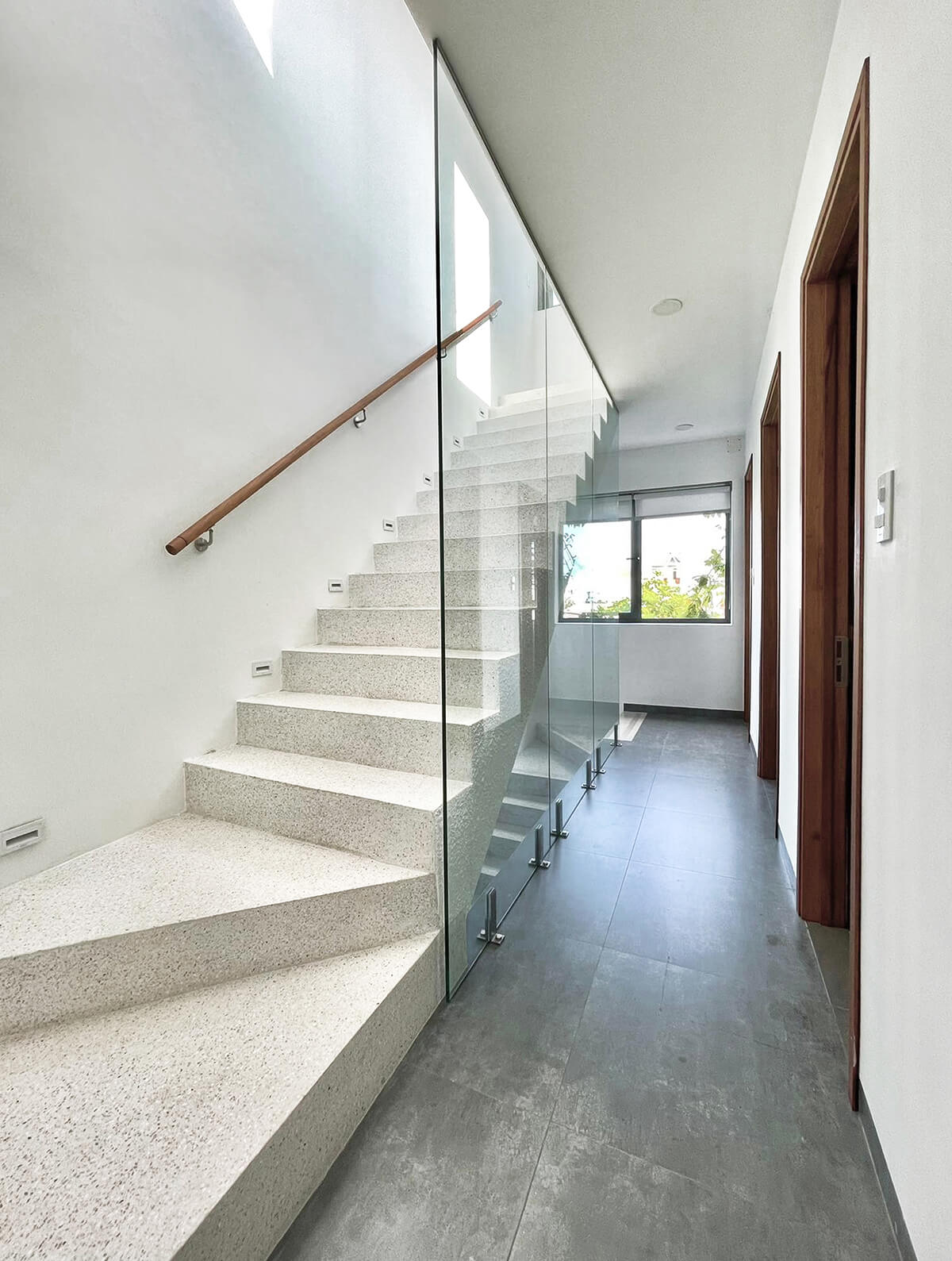 Vách ngăn cầu thang được làm từ kính cường lực, vừa tăng độ sáng cũng như tạo sự sang trọng cho ngôi nhà.