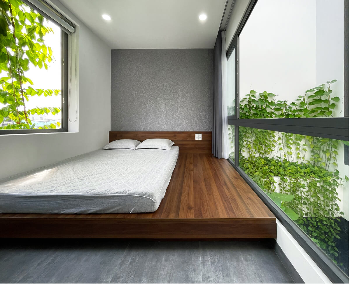 Ngoài phòng ngủ master, hai phòng ngủ còn lại diện tích nhỏ hơn nên kiến trúc sư thiết kế giường loại lớn rộng bằng chiều ngang phòng.