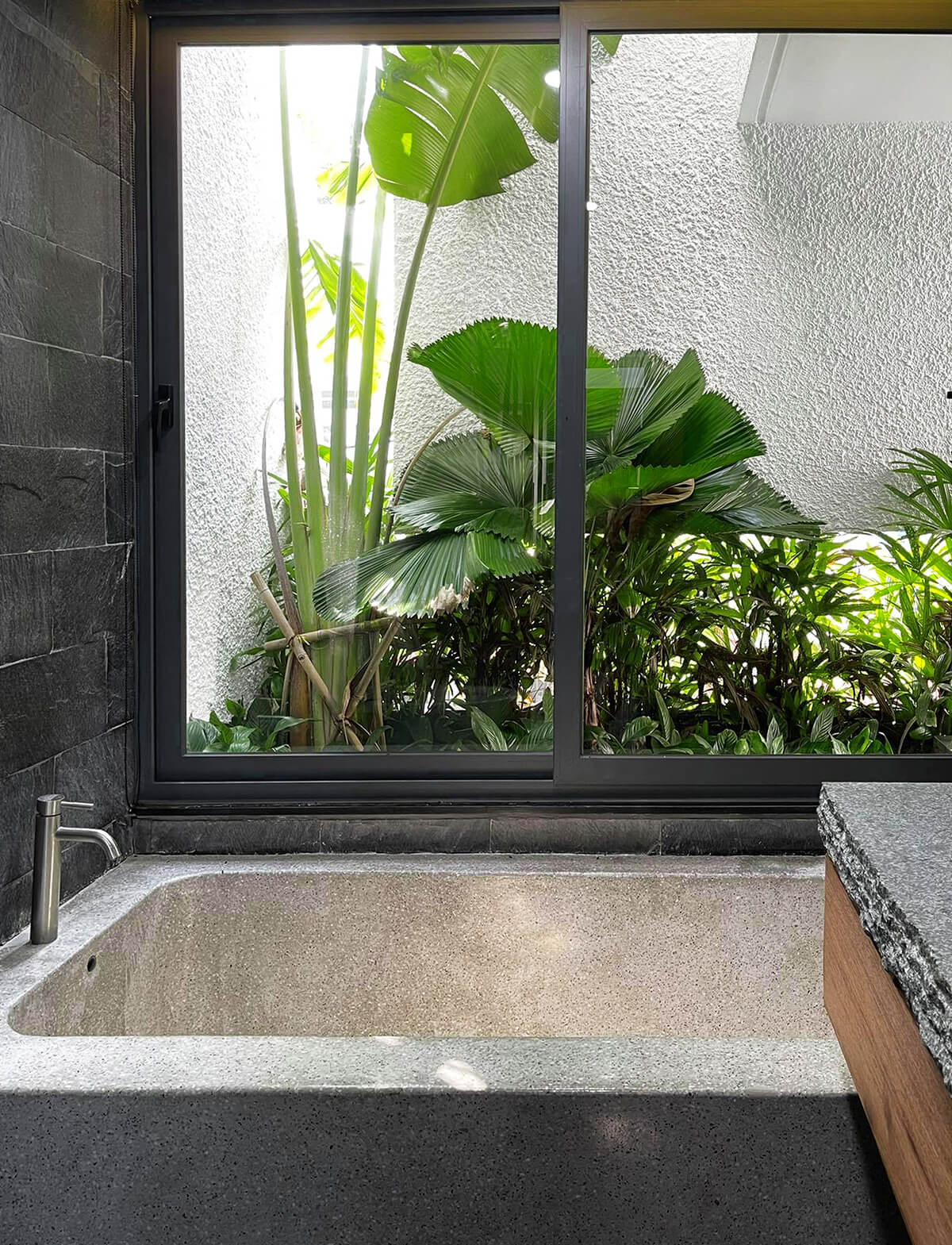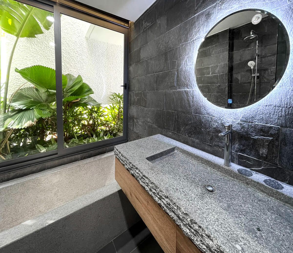 Mặt đá granite thô nhẵn, bóng mờ... vừa đạt độ thẩm mỹ cao, vừa đảm bảo công năng khi sử dụng do không bị ố vàng theo thời gian và không thấm nước.